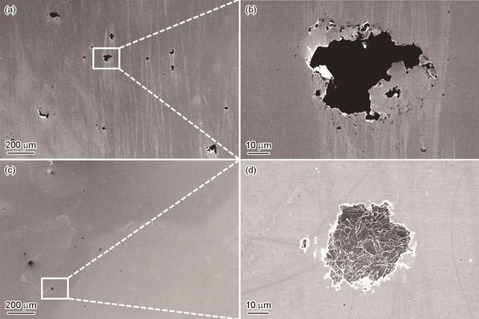 Pitting morphologies of 17-4PH stainless steel after immersion corrosion in 6%FeCl3 solution for 8 h: (a, b) extruded sample, (c, d) 2#DED sample