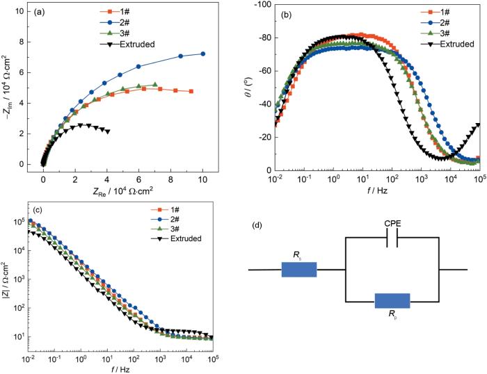 Nyquist plot (a) and Bode plots (b, c) of 17-4PH stainless steel in 3.5%NaCl solution and equivalent electriccircuit (d)