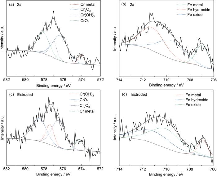 将2#DED和挤压样品在3.5%NaCl溶液中浸泡4 h后进行XPS表征,结果如图12所示,其中图12a,b为2#DED样品,图12c,d为挤压样品。图12a,c为Cr 2p的4个特征峰,分别对应Crmetal (574.24 eV)、Cr2O3 (576.47 eV)、CrO3 (578.51 eV)与Cr(OH)3(577.36 eV);图12b,d为Fe 2p的3个特征峰,分别对应Femetal (706.88 eV)、Fe2O3 (710.03 eV)与Fe(OH)3(711.11 eV),相应的结合能与文献报道一致[18]。可见,钝化膜均由Cr、Fe的氧化物和氢氧化物组成,其中对钝化膜保护作用起主要贡献的是Cr的氧化物。由峰面积计算Cr氧化物在Cr峰中的占比,即Crox/Crall,得到2#DED样品为0.78,挤压样品为0.74;同理计算Crall/Feall得到2#DED样品为0.92,传统挤压样品为0.63,这说明2#DED样品表面钝化膜的Cr氧化物占比更高,这是DED样品表面钝化膜具有更优保护性能的关键[19,20]。