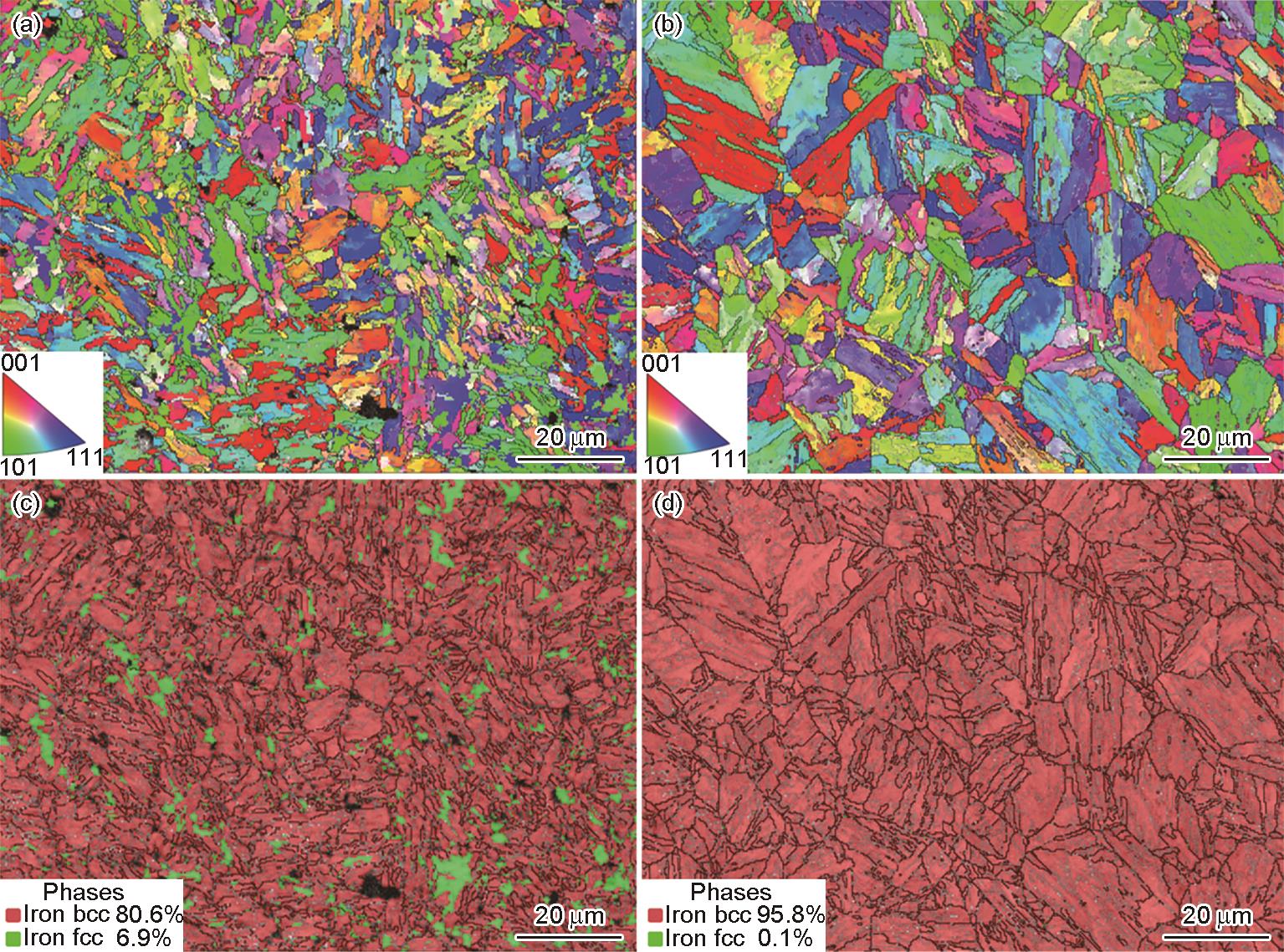 | Fig.4 EBSD characterization results of 17-4PH stainless steel DED and extruded samples: (a) IPF of 2#DED sample, (b) IPF of extruded sample, (c) phase distribution map of 2#DED sample, (d) phase distribution map of extruded sample |