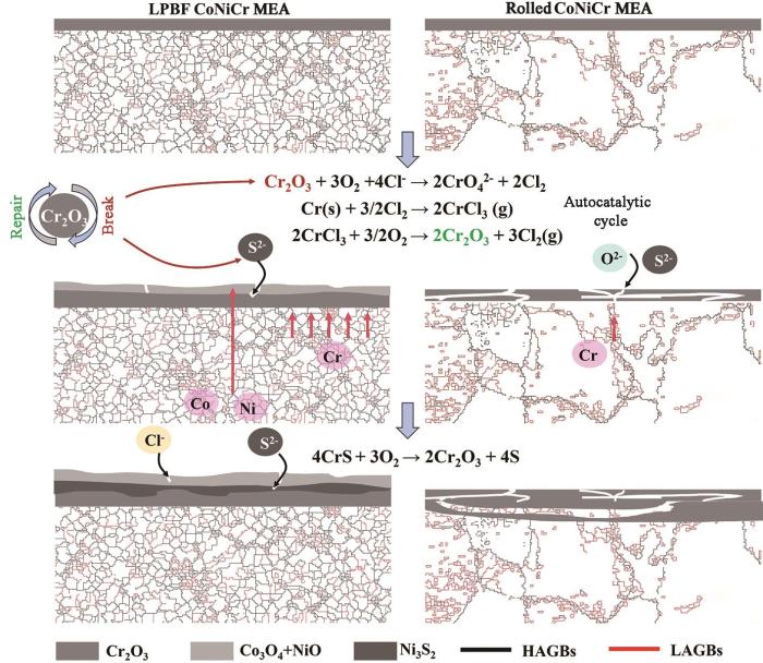 LPBF与轧制CoCrNi MEA在50%KCl-50%Na2SO4熔融盐膜中的腐蚀机理示意图