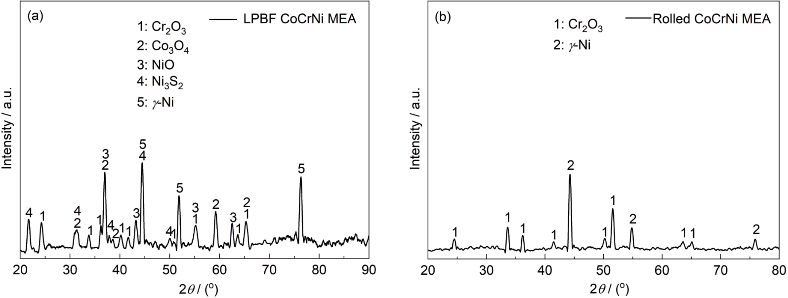 | Fig.8 XRD pattern of LPBF CoCrNi MEA (a) and rolled CoCrNi MEA (b) corrosion in the presence of 50%KCl + 50% Na2SO4 film for 48 h |