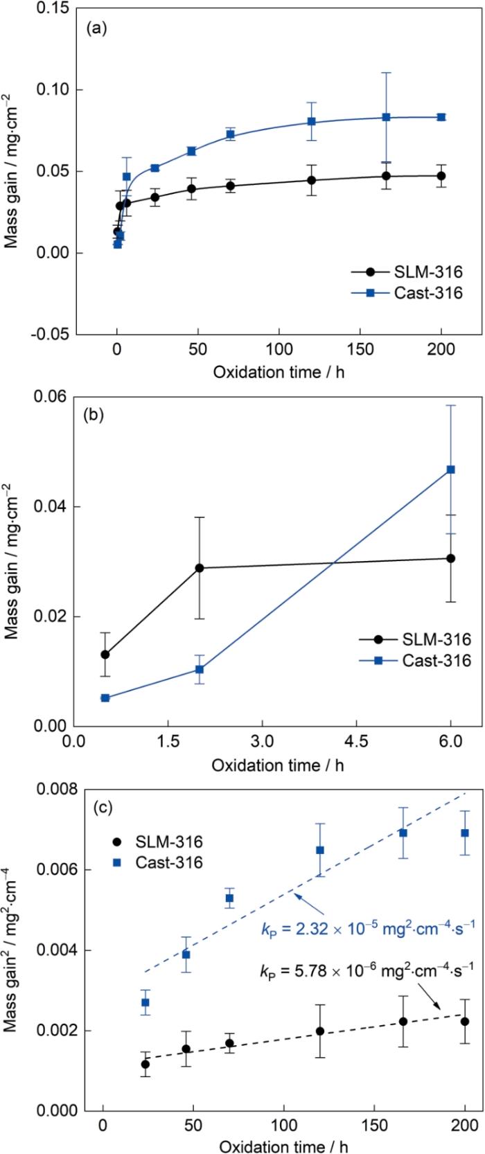 SLM-316与Cast-316不锈钢在700 ℃下氧化200 h的质量变化曲线如图2a和b所示。两种不锈钢试样的质量变化曲线呈现典型的抛物线规律。在氧化初期,两种不锈钢试样的质量快速增长,在氧化6 h后,试样质量的增长速度逐渐减慢,如图2a所示。在氧化初期,试样的质量变化快速增长主要是氧化初期的反应特点决定,试样表面的合金元素将直接参与氧化反应。而在稳态氧化阶段,氧化反应则由元素的扩散行为控制[17]。在700 ℃下氧化200 h后,SLM-316与Cast-316不锈钢试样的增重分别0.047和0.083 mg/cm2。SLM-316不锈钢的增重仅为Cast-316不锈钢增重的一半左右,揭示了选区激光熔化技术制备316不锈钢能改善其氧化抗力。