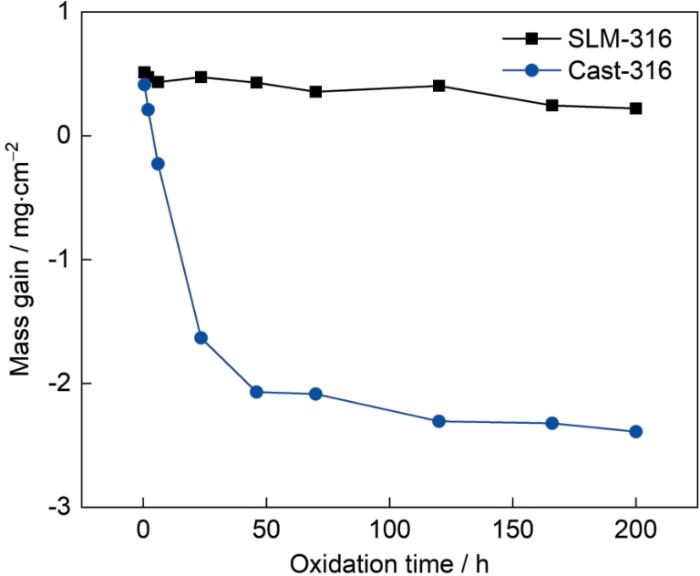 (1) SLM-316不锈钢表现出显著优于Cast-316不锈钢的抗高温氧化性能。经过700 ℃、200 h的高温氧化实验,SLM-316不锈钢的氧化增重仅为Cast-316不锈钢的一半左右,且其氧化膜更薄、更均匀致密。