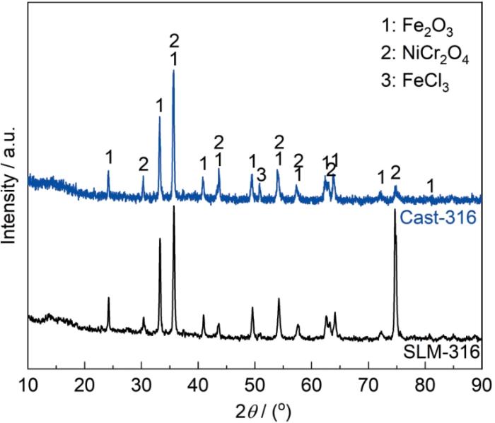 XRD patterns of Cast-316 and SLM-316 stainless steels after corrosion for 200 h at 700 oC with solid NaCl deposited