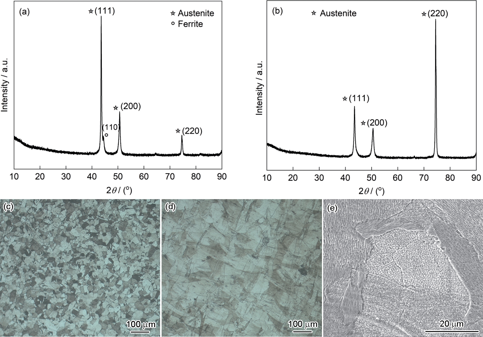 | Fig.1 XRD patterns (a, b) and microstructures of as-prepared Cast-316 (c) and SLM-316 (d, e) stainless steels |