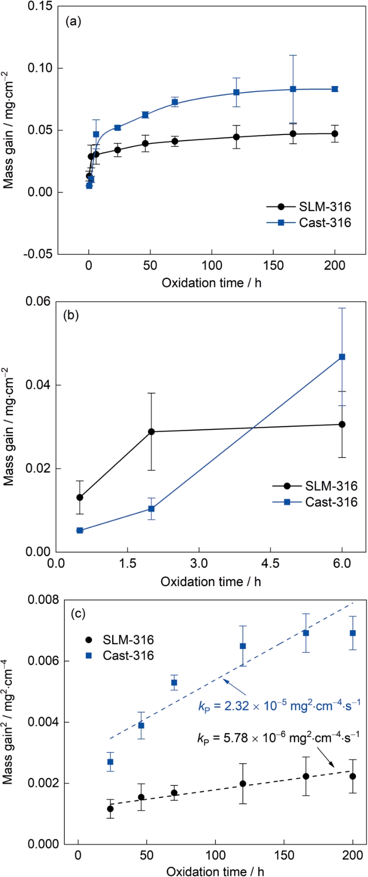 | Fig.2 Mass gain (a, b) and oxidation rate constants (c) of Cast-316 and SLM-316 stainless steels at 700 oC |