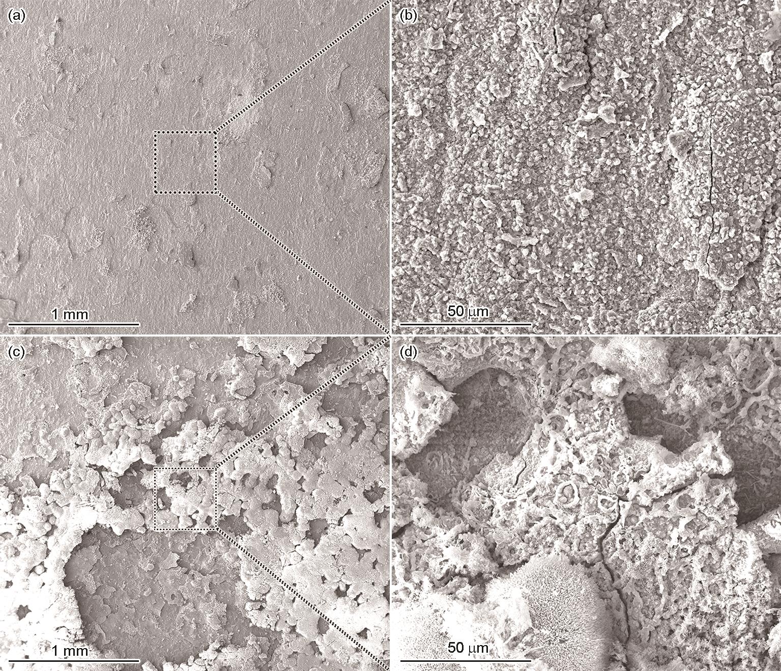 | Fig.8 Surface morphologies of Cast-316 (a, b) and SLM-316 (c, d) stainless steels after corrosion for 200 h at 700 oC with solid NaCl deposited |