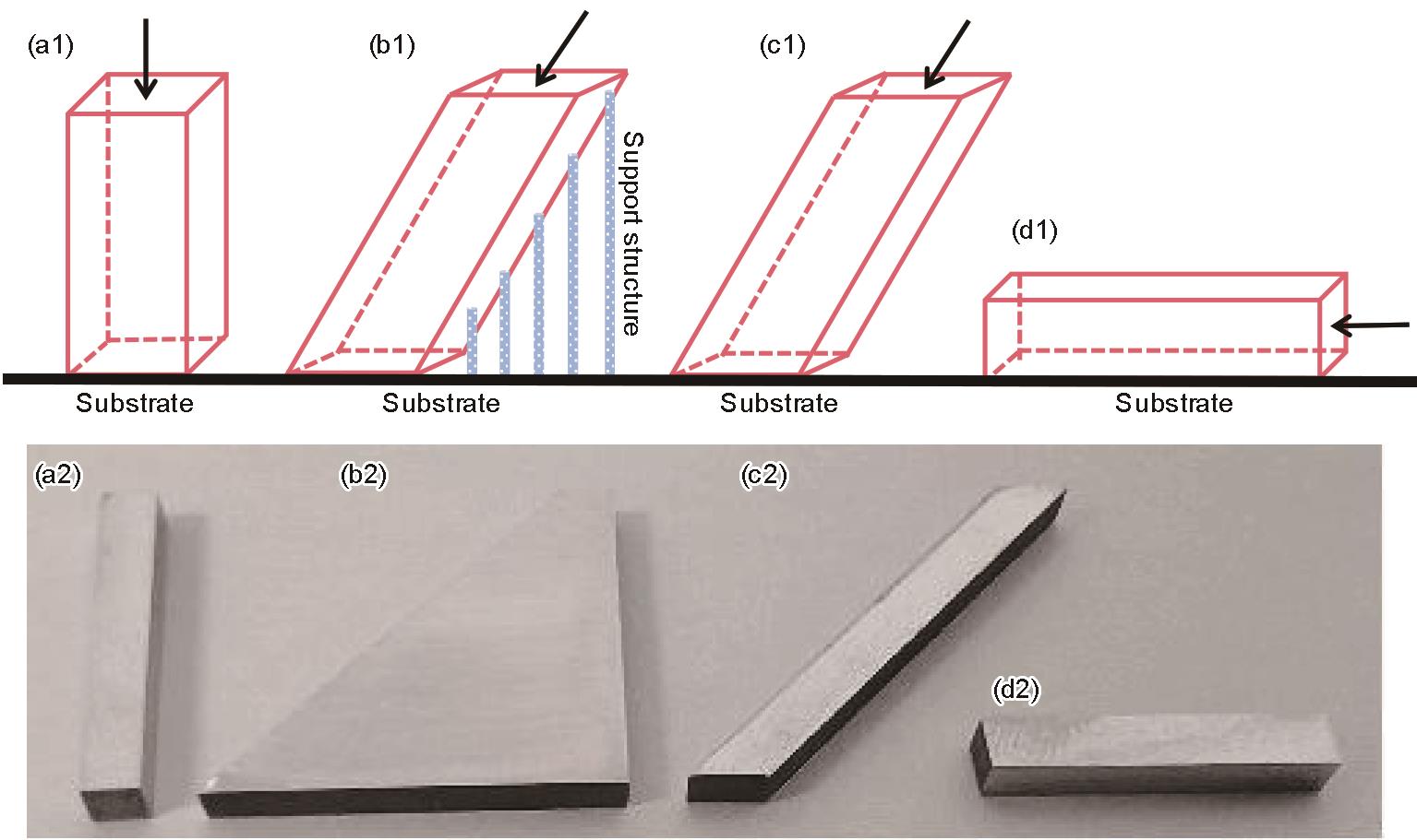 | Fig.1 Macroscopic schematics of four additive manufacturing AlSi10Mg alloy samples: (a) Vertical 90°, (b) Braced 45°, (c) Unbraced 45°, (d) Horizontal 0° |