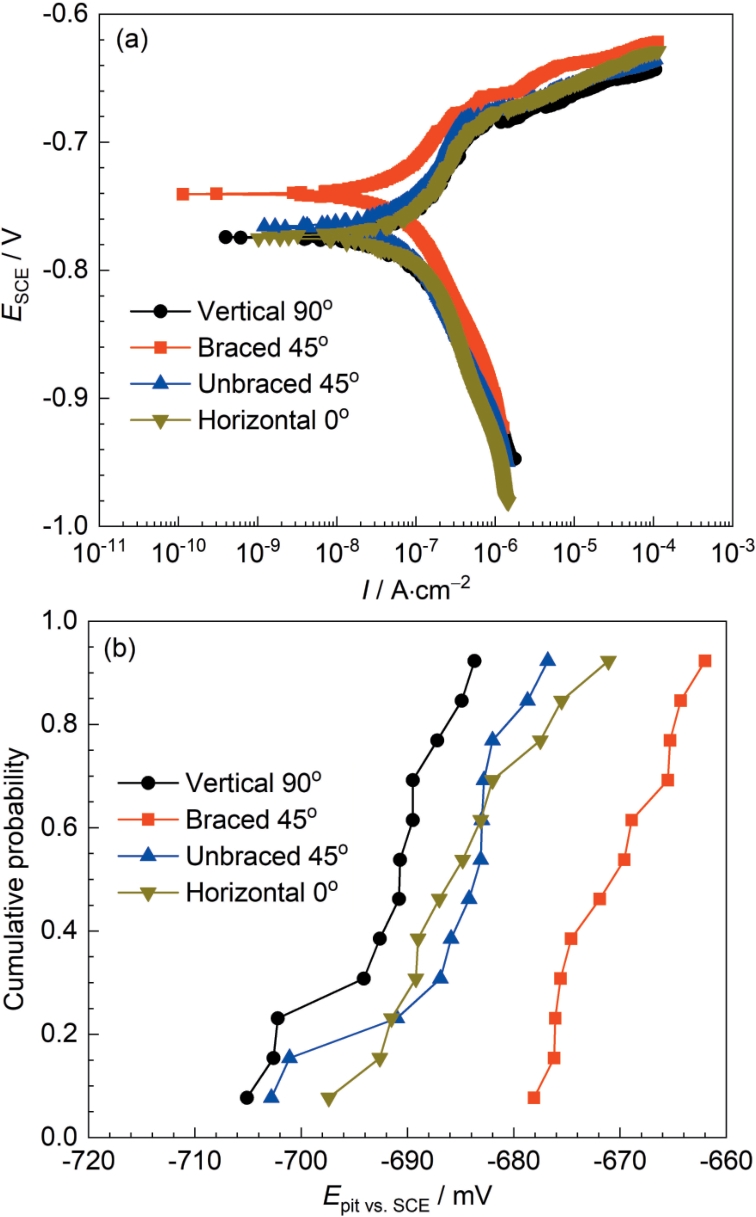 | Fig.8 Polarization curves (a) and corresponding cumul-ative probability distributions of pitting potentials (b) for four AlSi10Mg alloy samples in 3.5%NaClsolution |