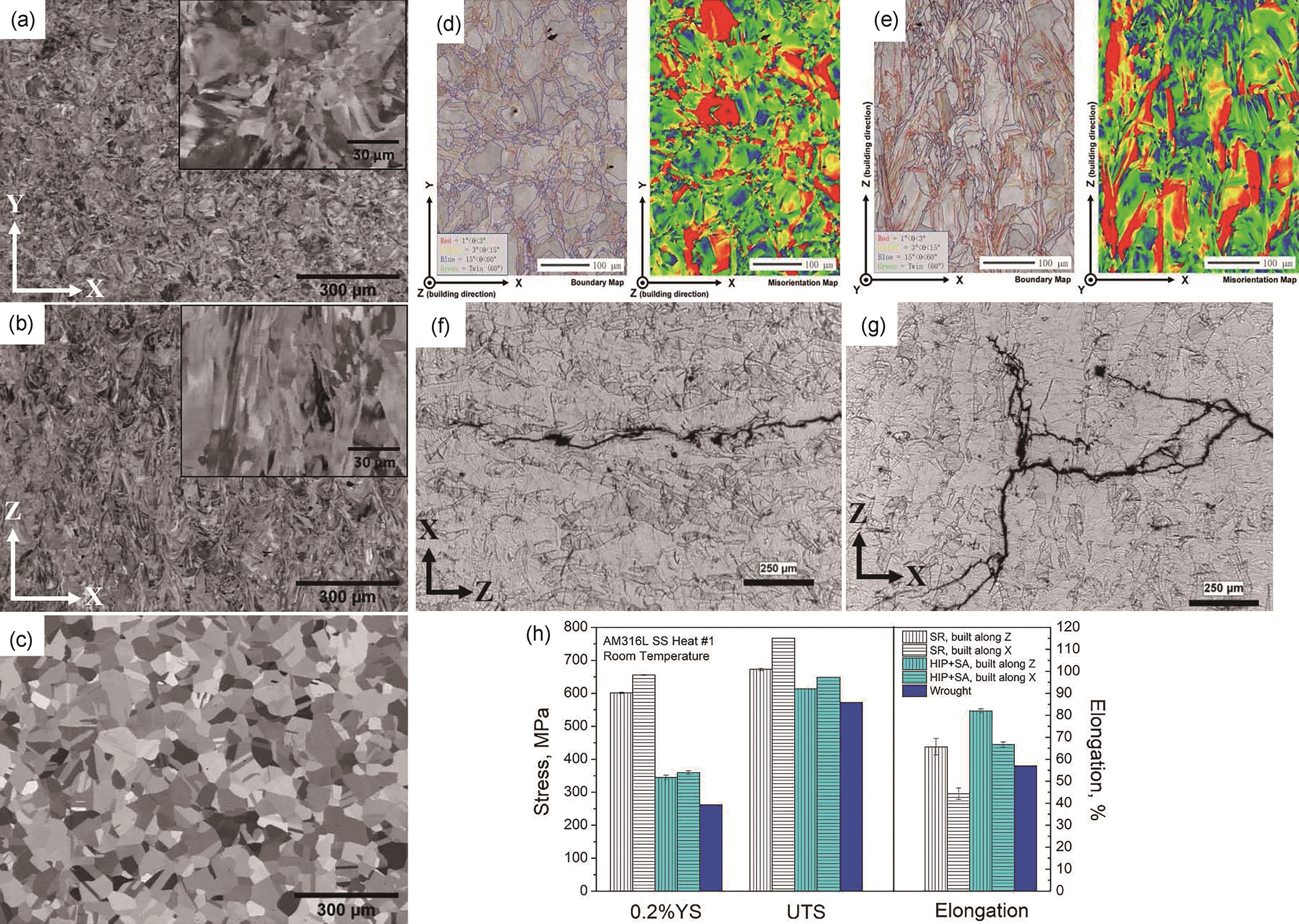 | Fig.2 Microstructural anisotropy (a-e) and differences in tensile cracking behavior before and after HIP treatment (f-h) in LPBF-316L stainless steel[ |