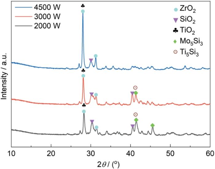 为了探究表面涂层的物相组成,图7为不同激光功率制备的涂层表面XRD图谱。可以看出,功率为2000 W时涂层的主要成分为ZrO2、TiO2、SiO2以及较多的Mo5Si3相,这归因于功率较小能量密度低,该区域没有形成足够的、具有优异保护性的MoSi2相,从而停留在亚稳态Mo5Si3相,随时间的进行,Mo5Si3氧化会生成MoO3挥发。随着功率的提高,3000 W时涂层中成分主要为ZrO2、SiO2、TiO2和少量Mo5Si3以及Ti5Si3,表明元素开始合金化,Ti5Si3作为高温稳定相,能够提升抗氧化性能。而4500 W时涂层的成分主要是ZrO2、TiO2和SiO2,同时,结合图6截面分析可知,涂层内部存在大量Mo富集。