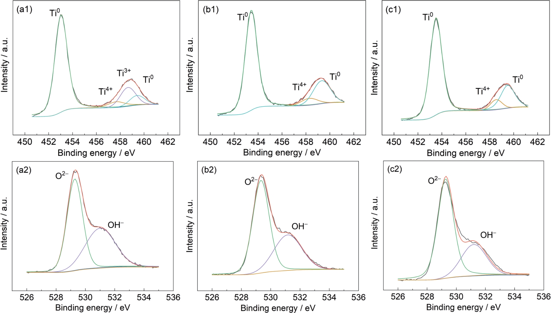 | Fig.9 XPS results of passivation films on traditional TC4 (a), SLM-TC4 (b) and WAAM-TC4 Ti-alloys (c): (a1-c1) Ti spectra, (a2-c2) O spectra |