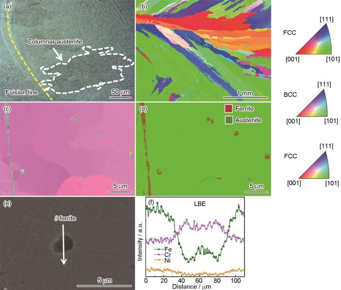 铅冷快中子反应堆(LFRs)具有高安全性、高经济性、可传递放射性核素等优点,是最有应用前景的第四代堆型之一。液态铅铋共晶合金(LBE)是中子反应堆的首选冷却剂。然而,高温、高密度、高流速的液态铅铋共晶合金会对反应堆结构材料产生强烈的腐蚀,影响反应堆的运行安全。304L不锈钢是该反应堆的一种候选结构材料,而电弧增材制造则是改善该钢组织结构的新方法,故本文,研究并揭示了电弧增材制造的304L不锈钢中δ-铁素体对其在550 ℃、饱和氧/贫氧的液态铅铋共晶合金中的腐蚀行为的影响。结果表明,在饱和氧的液态铅铋共晶合金中,电弧增材制造的304L不锈钢表面形成3层氧化膜。其中,δ-铁素体展现出比奥氏体更强的抗氧化腐蚀能力,其会在相界处形成Fe-Cr尖晶石保护层,阻碍氧化腐蚀,因此在内氧化区呈现出钳子状形貌。在贫氧的液态铅铋共晶合金中,该钢主要发生溶解腐蚀。其中,由于O含量限制,δ-铁素体的表面虽然无法形成富Cr的保护膜,不能有效阻碍溶解腐蚀,但是δ-铁素体依然具有良好的耐溶解腐蚀性能,这主要归功于δ-铁素体具有较低的Ni含量,而溶解腐蚀主要受Ni的溶解控制。