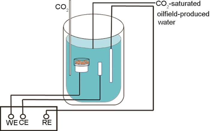 Schematic diagram of electrochemical testing device using X65 steel covered with SiO2 or CaCO3 inert deposit as working electrode
