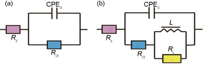 Equivalent circuit models fitting EIS: (a) only three elements, (b) with inductance