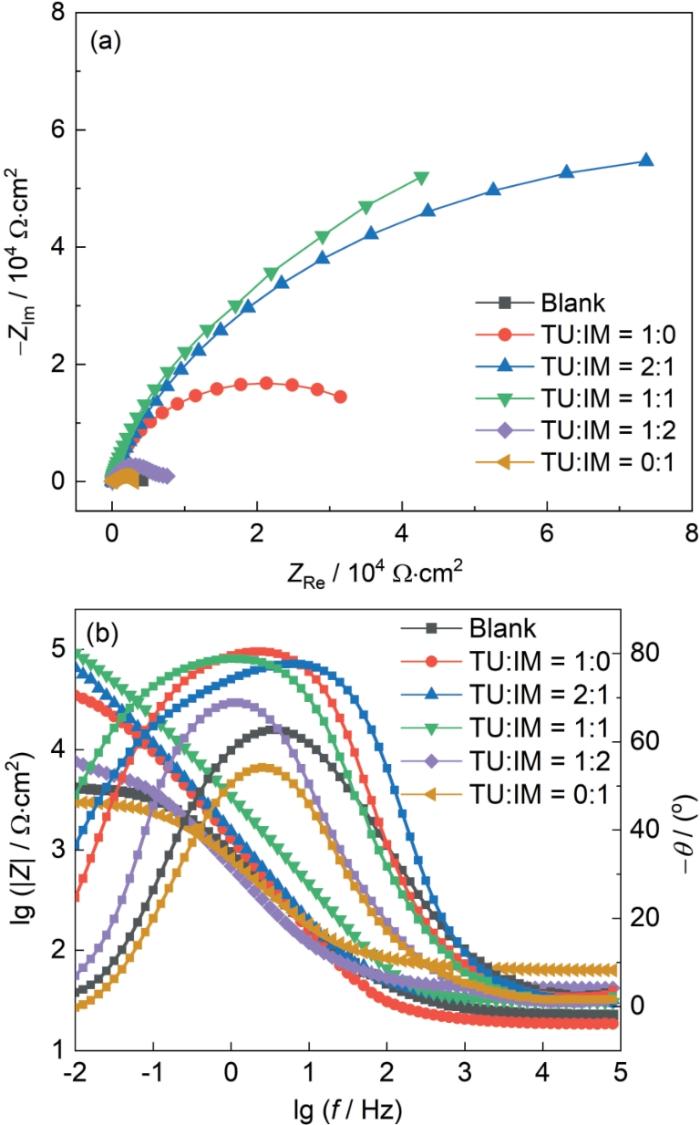 为了进一步提升缓蚀性能,将TU与IM缓蚀剂进行复配,控制TU与IM缓蚀剂的总量为100 mg/L,改变二者质量配比,其EIS谱如图6所示,复配比为TU∶IM = 1∶2和0∶1时缓蚀溶液容抗弧半径最小,与空白溶液容抗弧半径相似;并且0.01 Hz低频时阻抗模值与空白组模值相接近,表明其未产生缓蚀作用。当TU和IM复配比例为2∶1和1∶1时,Nyquist图中容抗弧半径明显的增加,Bode图中相位角峰增大,峰宽变宽。说明该缓蚀溶液下在金属表面产生了相对更加牢固的吸附层,阻止了腐蚀性离子向金属表面扩散,阻碍了腐蚀性离子与金属表面的直接接触,降低了腐蚀速率。