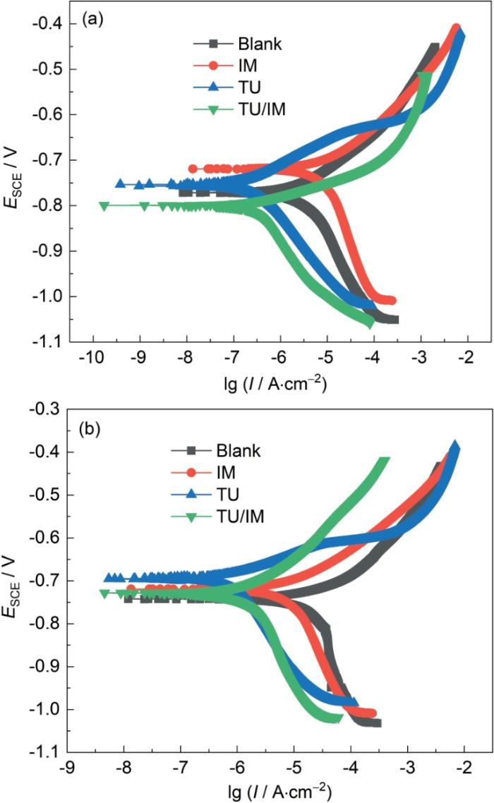 Potentiodynamic polarization curves of X65 electrodes covered with SiO2 (a) and CaCO3 (b) after 72 h immersion at 25 oC in CO2-saturated blank solution and simulated solutions contain-ing 100 mg/L corrosion inhibitors of TU, IM and TU/IM, respectively