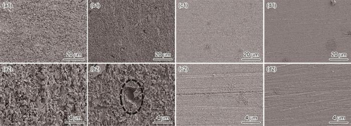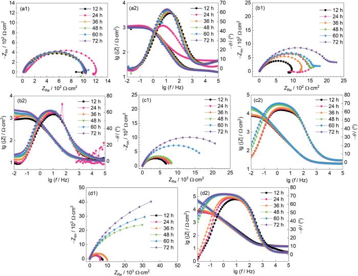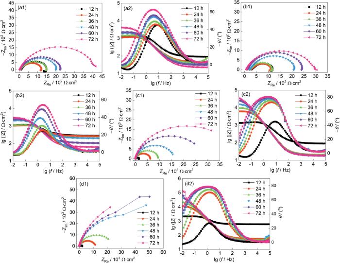 当开路电位(OCP)波动范围小于2 mV时,即认为该测试体系达到稳定状态,随后测定动电位极化曲线和EIS谱。动电位极化曲线测试的扫描范围为-300~300 mV (vs. OCP),电位扫描速率为0.167 mV/s;电化学阻抗采用频率范围为105~10-2 Hz、幅值为10 mV的正弦波交流电压进行测试。通过Zsimpwin软件对EIS测量数据进行拟合分析,利用Cview 2软件拟合极化曲线,以得到相应的电化学参数。