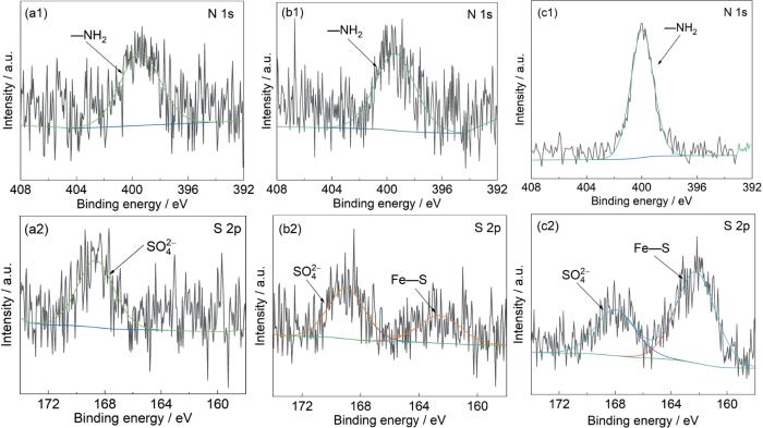 图12为SiO2垢下金属在IM、TU和TU/IM 3种缓蚀溶液浸泡后表面各元素的高分辨率能谱,3种缓蚀溶液的金属表面均出现N 1s和S 2p峰,其中S 2p来源于油田采出水中的硫酸盐和缓蚀剂中的硫脲基团[29],而N 1s仅来源于缓蚀剂。如图12a所示,在IM缓蚀溶液中浸泡的金属表面的精细谱图,其表面未检测到Fe—N,这可能是由IM缓蚀剂在垢下金属表面的吸附量较低造成的;但是检测到了400 eV附近的—NH2[30],说明IM缓蚀剂在金属表面有微量吸附,这也与IM缓蚀效率很低相一致。图12b为在TU缓蚀溶液金属表面的精细谱图中,检测到了403.10 eV的Fe—N键[31]和162.03 eV的Fe—S键[32],Fe—N、Fe—S是TU中的N和S原子与Fe原子配位后形成的,这进一步证实了TU缓蚀剂在垢下金属表面的吸附。从图12c中可以看出,TU/IM与Fe形成了Fe—S配位键,表明TU缓蚀剂分子扩散透过沉积物并吸附在金属表面;同时在N 1s精细谱图中,位于399.2 eV的—NH2含量高于单一的TU缓蚀剂,由此推测,电极表面的缓蚀剂吸附膜层由TU和IM共同组成。