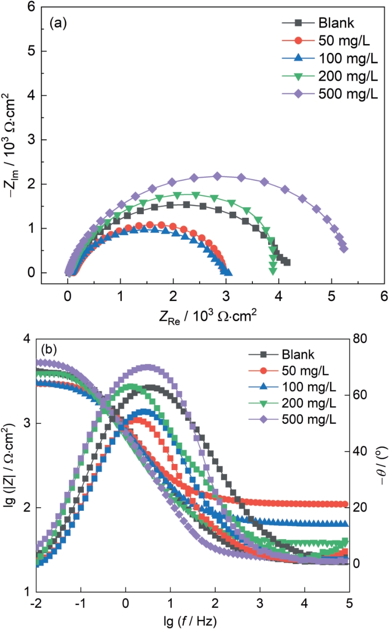 | 图4 SiO2垢下电极在不同浓度的IM缓蚀溶液中浸泡72 h的EIS谱图 |