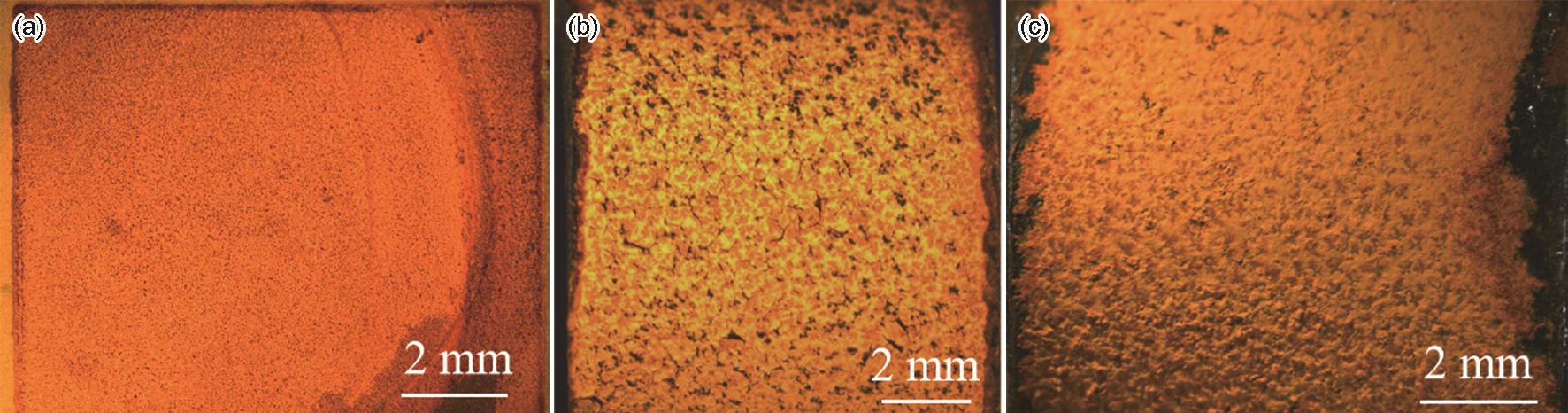 | Fig.2 Surface morphologies of 40Cr steel immersed in 3.5%NaCl solution for 120 h under different conditions: (a) 0% strain/dark, (b) 6% strain/dark, (c) 6% strain/UV |