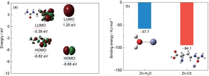 HOMO-LUMO orbital energy levels of Cit and H2O (a) and binding energies of Zn2+ with Cit and H2O (b)