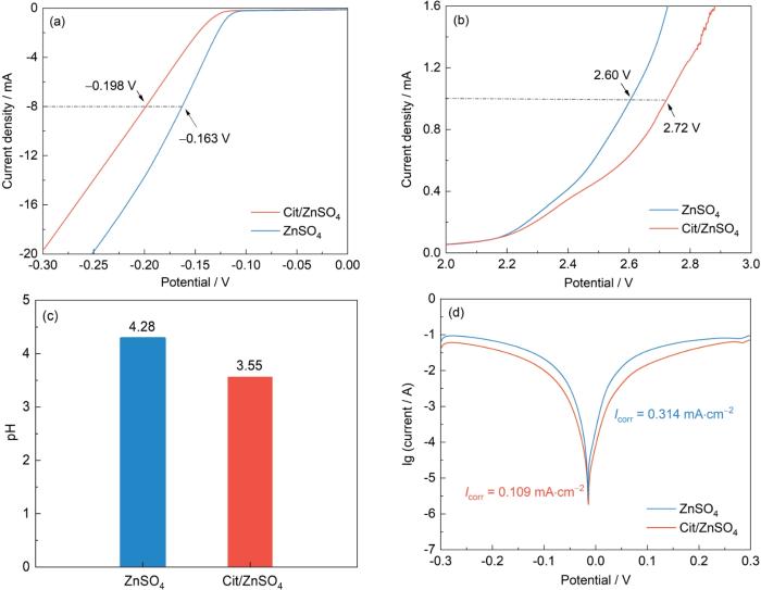 通过Zn||Ti不对称电池的LSV测试,揭示了Cit对电解液性能的多维度调控机制(图5a和b)。在-0.3~0 V区间内,相较于纯ZnSO4电解液,Cit/ZnSO4电解液在相同电流密度下的HER电位负向偏移,表明Cit的加入显著增大了HER的活化能垒,抑制了Zn负极表面的副反应。在1.9~3.0 V高电位区间,Cit的引入使析氧反应(OER)起始电位明显正移,有效拓宽了电解液的电化学反应窗口,为ZIBs的循环稳定性提供了保护[31]。pH测试显示(图5c),Cit的引入使2 mol/L ZnSO4电解液的pH从4.28降至3.55,表明游离H⁺浓度增加。尽管高H+浓度可能加速腐蚀,但适当的pH变化并未显著影响Zn负极。Tafel测试进一步证实,Cit/ZnSO4电解液的腐蚀电流从0.314 mA·cm-2显著降低至0.109 mA·cm-2 (图5d)。这些结果表明,Cit通过极性官能团重构了Zn2+溶剂化结构,优化Zn2+传输动力学,同时削弱水分子氢键网络、降低H2O活性,协同抑制HER反应并提升Zn负极稳定性。