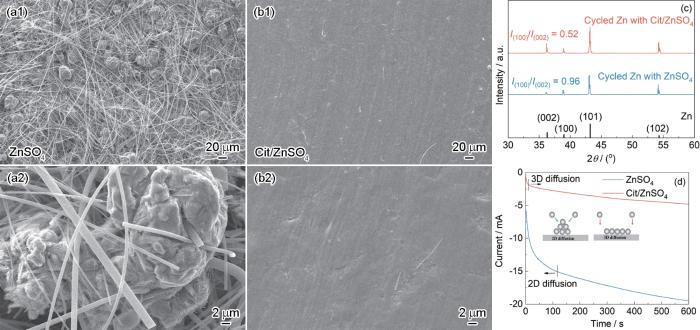 为了更加清楚的观察锌沉积形貌,对电镀不同时间的锌箔进行了SEM测试。如图8a和b所示,在10.0 mA·cm-2电流密度下,2 mol/L ZnSO4电解液中锌沉积行为是先在锌箔表面形成较为粗糙的锌床,随着电镀时间的增加,在锌床上形成大量的随机分布的Zn凸起物。通过其放大图(图8c,d),可见Zn凸起物是生长在锌床上的尖锐的锌沉积物,并且随着时间的增加,这些锌沉积物变得更加尖锐。与2 mol/L ZnSO4电解液中锌沉积行为不同的是,Cit/ZnSO4电解液中锌负极的沉积物顶部是层层堆叠的致密结构,这避免了Zn枝晶形成刺破隔膜而导致电池短路。这些结果表明,Cit通过调控Zn2⁺沉积行为,有效抑制了Zn枝晶的不可控生长。并缓解了因局部电流密度集中而加剧的HER反应,从而实现了Zn负极的稳定防护。
