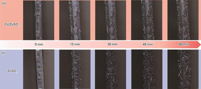 In situ optical microscopy images showing the deposition of Cit/ZnSO4 (a) and ZnSO4 (b) at 5.0 mA·cm-2