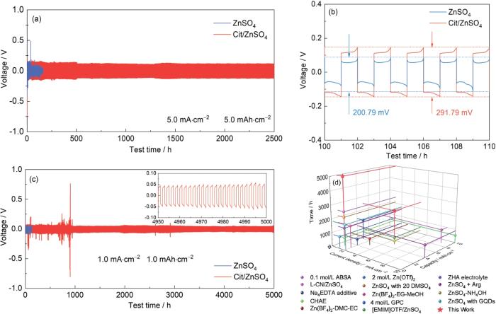 Cycling performances of Zn||Zn cells at 5.0 mA·cm-2 and 5.0 mAh·cm-2 (a, b) and at 1.0 mA·cm-2 and 1.0 mAh·cm-2 (c), and cycle life comparison plot (d)