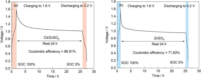 Self-discharge curves of Zn||V2O5 full cells with Cit/ZnSO4 electrolyte (a) and 2 mol/L ZnSO4 electrolyte (b)