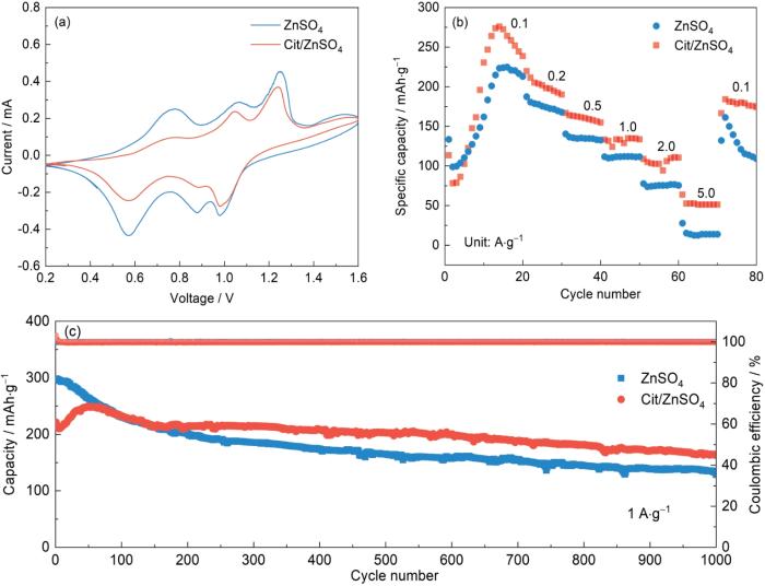 (3) 基于Cit/ZnSO4电解液的Zn||Zn对称电池在5.0 mA·cm-2和5.0 mAh·cm-2条件下仍能稳定循环2500 h。此外,Zn||V2O5全电池在1.0 A·g-1电流密度下循环1000次后仍保持较高的容量保持率。这些性能都显著优于纯2 mol/L ZnSO4电解液的电化学性能。表明Cit加入实现了电解液-电极界面的协同调控,增强了对Zn负极的防护,显著提升ZIBs的循环稳定性和容量保持率。