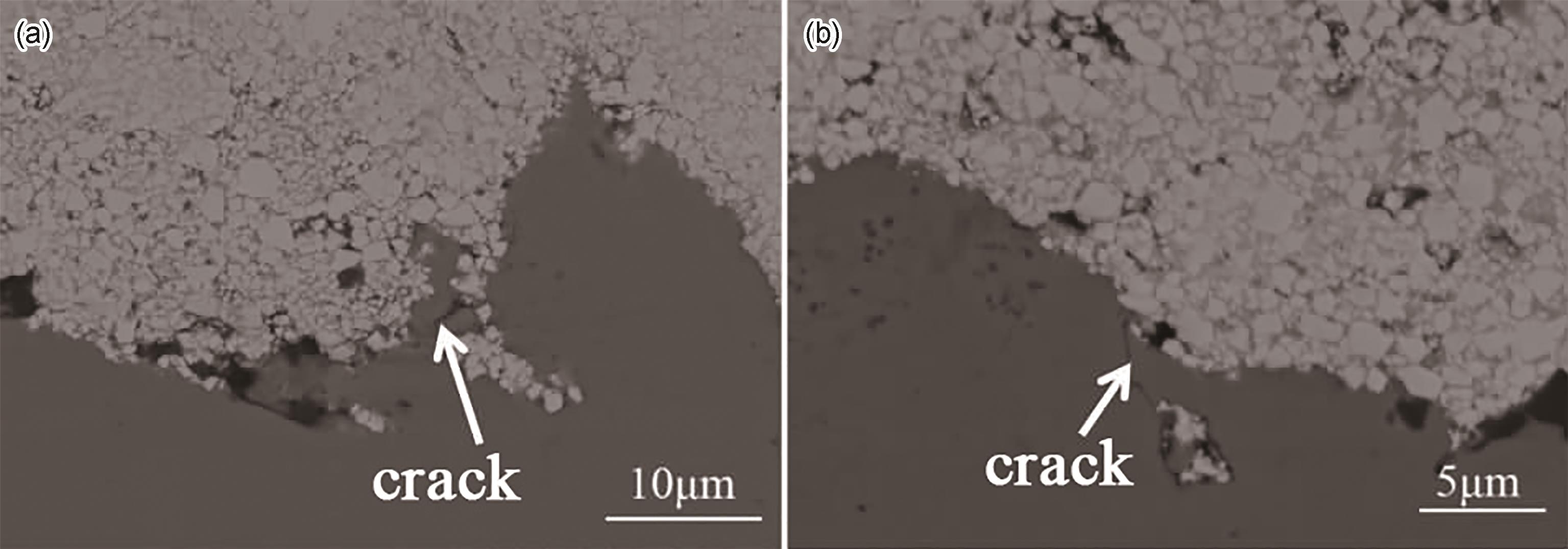 | Fig.4 Enlarged images of the interface between HVOF deposited WC-10Co-4Cr coating and 27SiMn steel substrate: (a) metallurgical bonded area and crack, (b) crack[ |