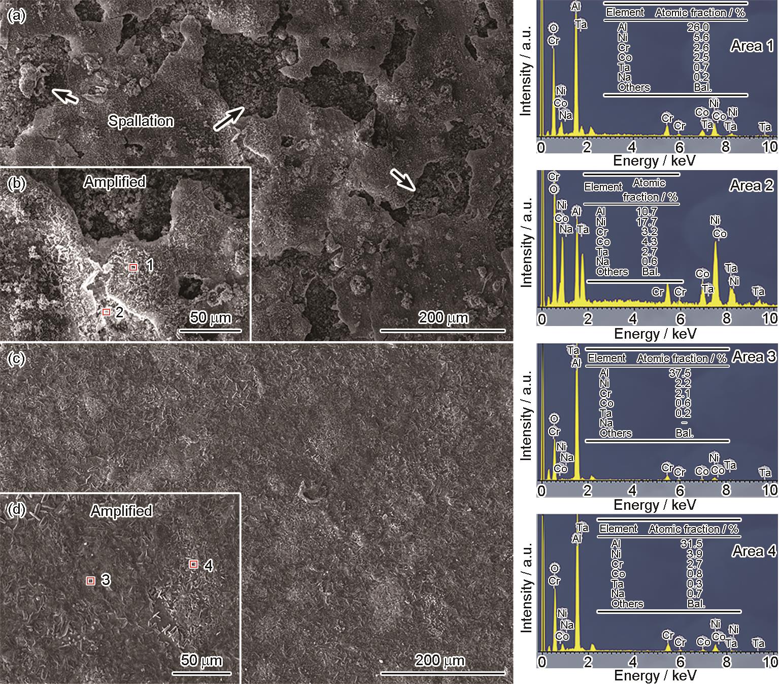 | Fig.4 Surface morphologies of N5 alloy (a, b) and SN coating (c, d) after hot corrosion in molten mixed sulfates and corresponding EDS results |
