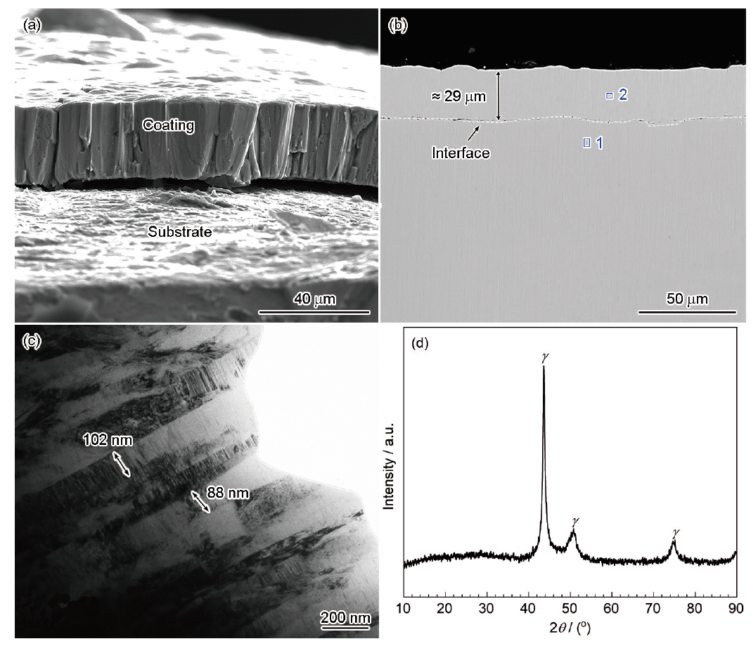 | Fig.1 Fracture morphology (a), cross-sectional SEM image (b), cross-sectional TEM image (c) and phase constituents of the as-deposited sputtered nanocrystalline (SN) coating (d) |
