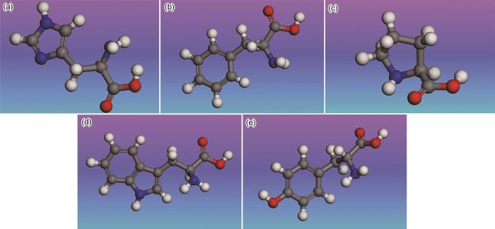Geometrically optimized structures of histidine (a), phenylalanine (b), proline (c), tryptophan (d) and tyrosine (e)