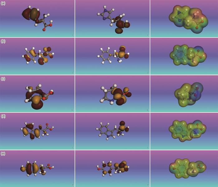 HOMO (left), LUMO (middle) orbital and electrostatic potential (ESP) distribution of histidine (a), phenylalanine (b), proline (c), tryptophan (d) and tyrosine (e)