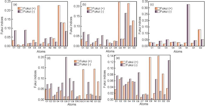 Fukui function index of histidine (a), phenylalanine (b), proline (c), tryptophan (d) and tyrosine (e)