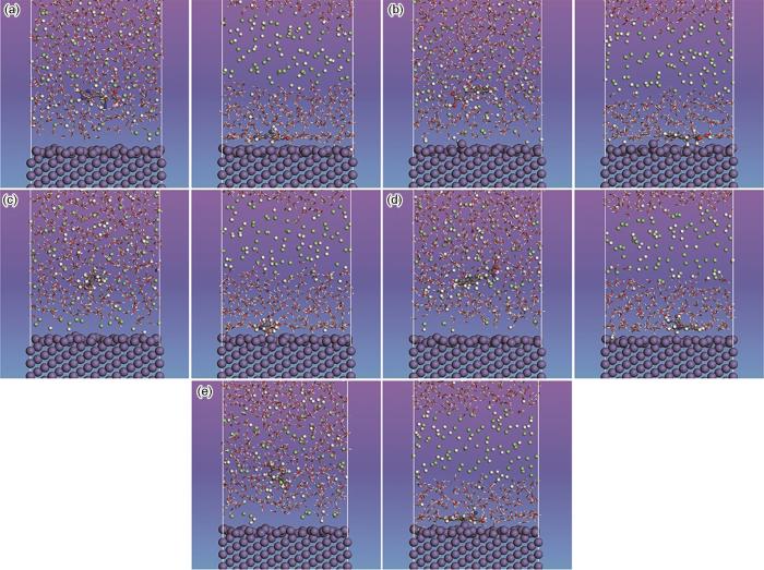 以Fe作为金属基底,在HCl溶液中研究了氨基酸分子在Fe表面的吸附行为。图5a~e展示了5种氨基酸分子在Fe表面的吸附前后的构像。吸附前(左侧),氨基酸分子以不规则形态存在于酸液中,且与金属表面保持较远距离;吸附后(右侧),氨基酸分子基于其分子中的环状结构,以平行于Fe(110)表面的方式吸附在其表面,从而在金属表面形成致密的吸附膜,有效阻止腐蚀介质与金属表面的接触。
