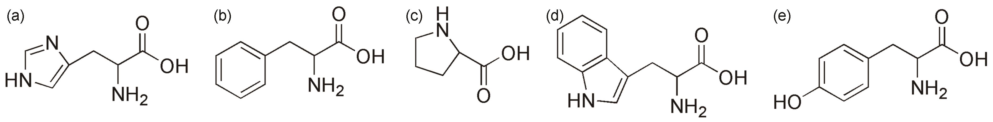 | 图1 组氨酸、苯丙氨酸、脯氨酸、色氨酸以及酪氨酸的分子结构图 |