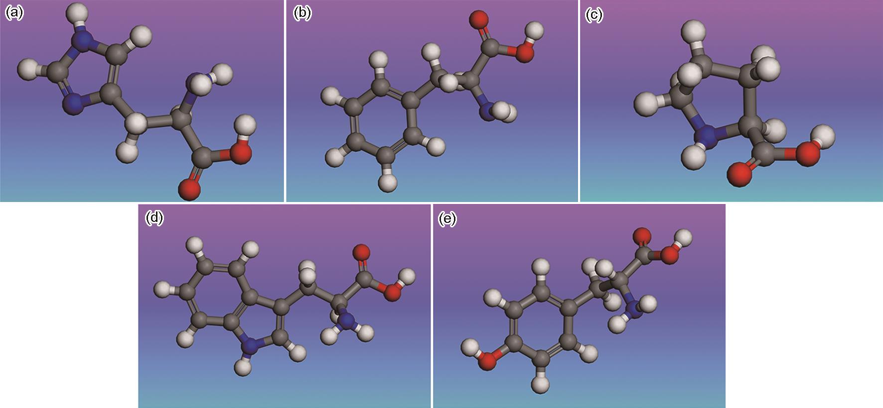 | Fig.2 Geometrically optimized structures of histidine (a), phenylalanine (b), proline (c), tryptophan (d) and tyrosine (e) |