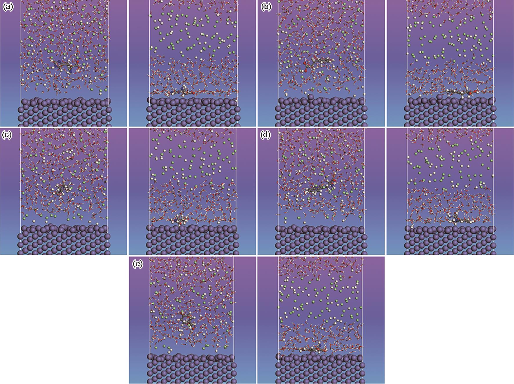| Fig.5 Conformation before (left) and after (right) adsorption on Fe(110) surface of histidine (a), phenylalanine (b), proline (c), tryptophan (d) and tyrosine (e) |