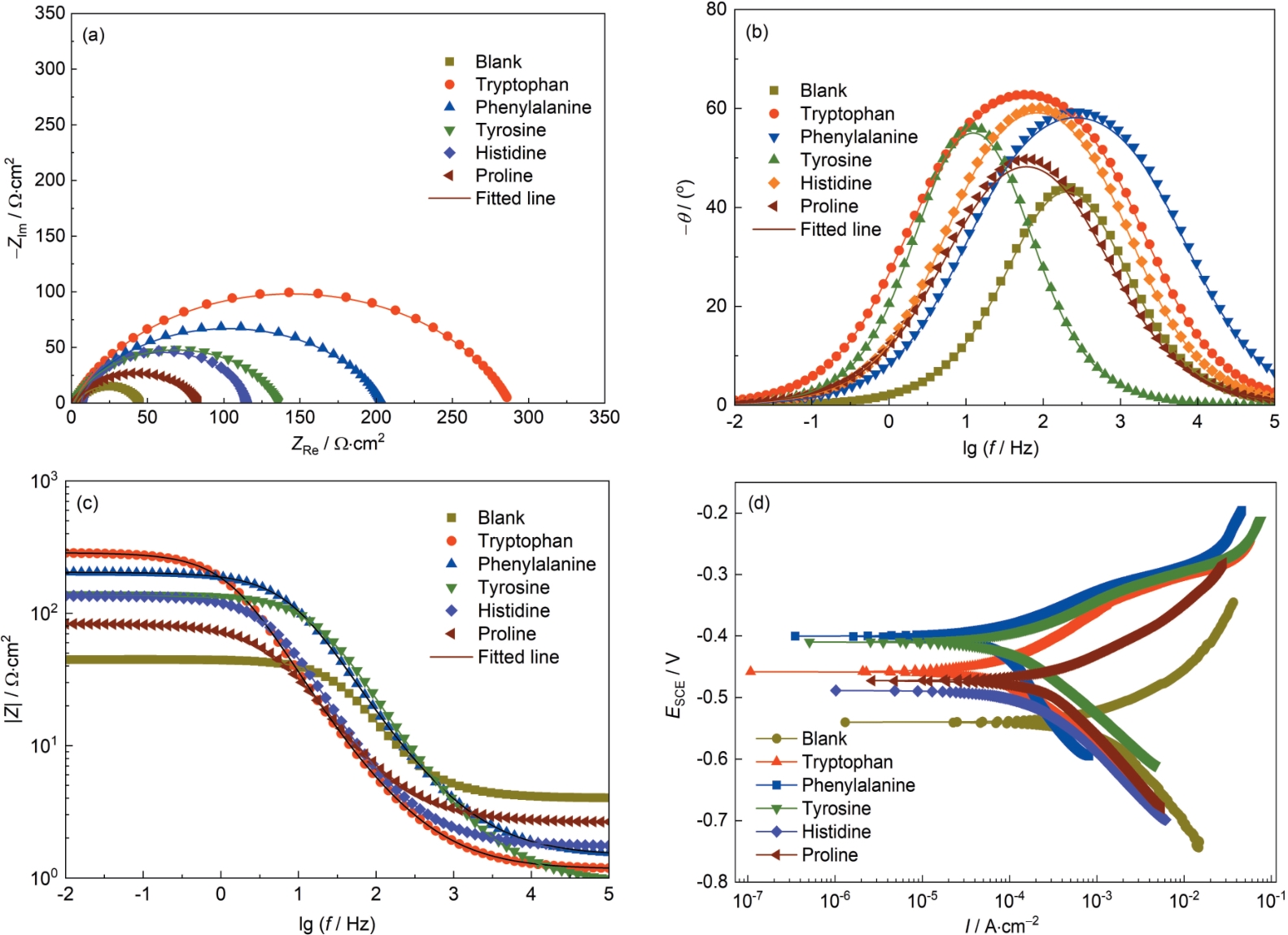 | Fig.9 Electrochemical results of N80 steel in 20%HCl solution with and without amino acids: (a) Nyquist plots, (b) Bode plots, (c) Bode phase diagram, (d) potentiodynamic polarization curves |