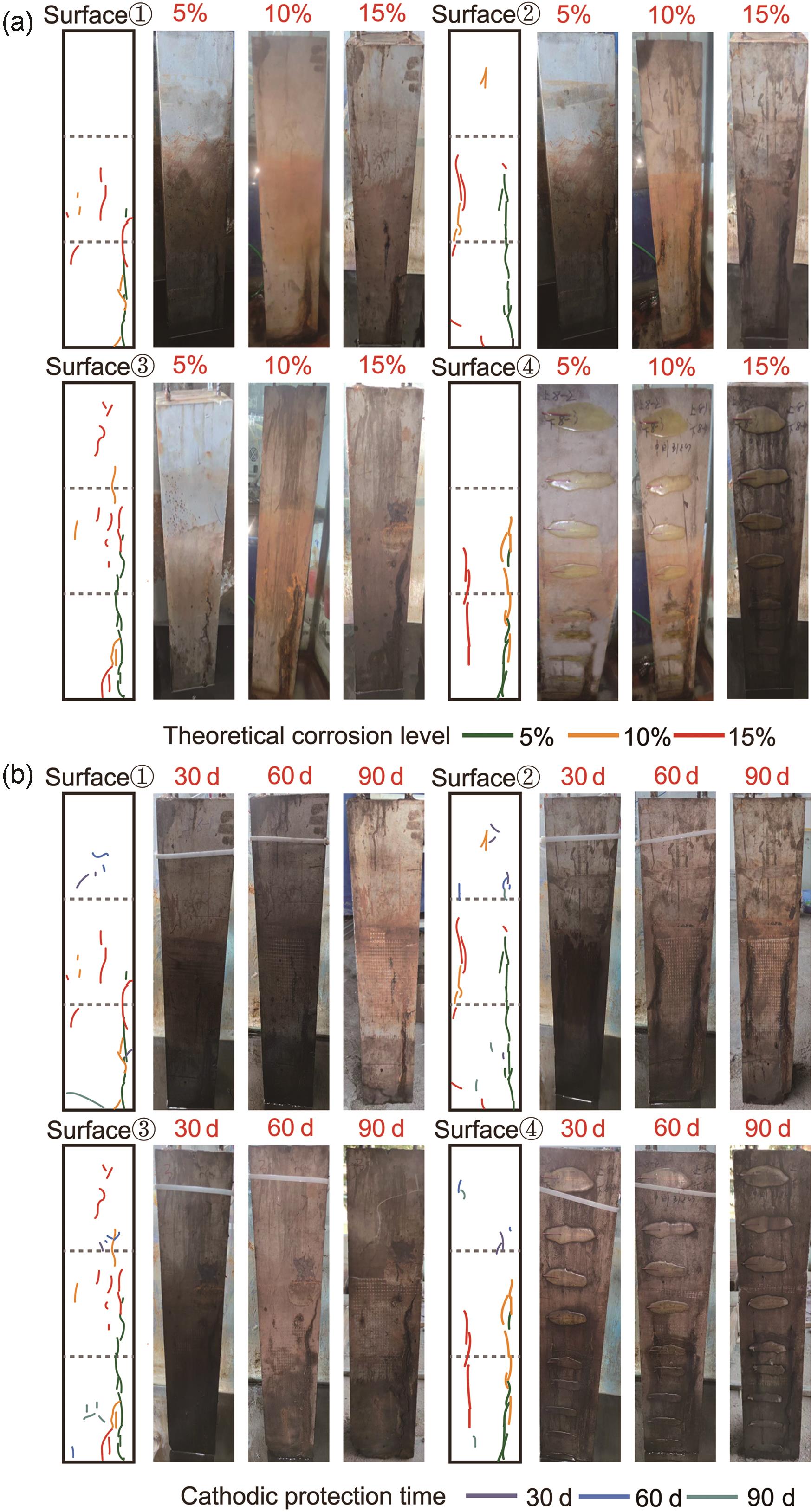 | Fig.5 Propagation of cracks during corrosion (a) and cathodic protection (b) stages |