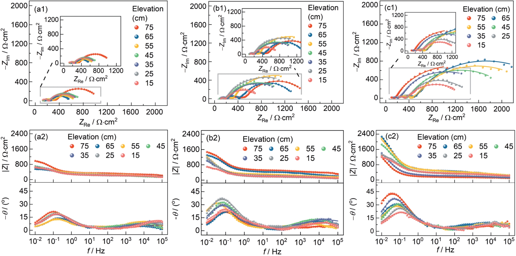 | Fig.9 EIS spectra of RC pile during cathodic protection stage: (a) 30 d, (b) 60 d, (c) 90 d |