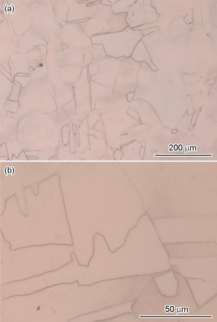 | Fig.4 Metallographic microstructure characterization of B10 Cu-Ni valve: (a) low magnification image, (b) high magnification image |