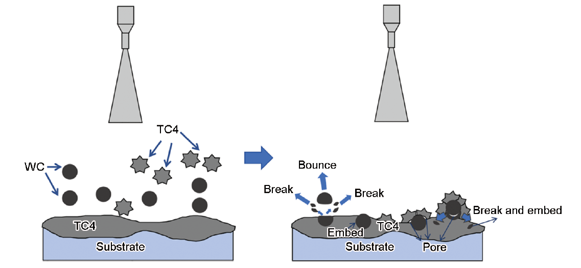 | Fig.4 Deposition mechanism of cold-sprayed TC4-WC coating |
