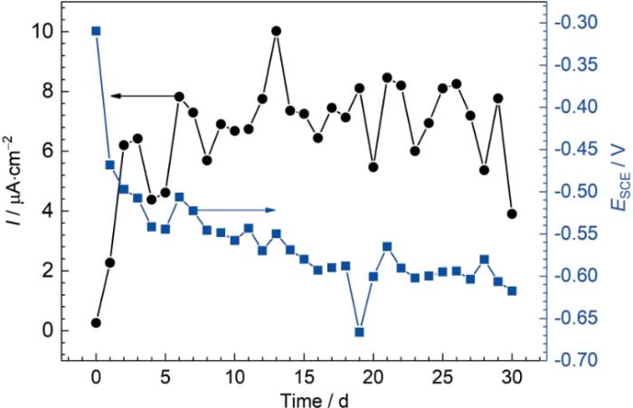 Galvanic voltages and galvanic current densities of TP2-AA1060 alloy couple after immersion in 55% ethylene glycol aqueous solution for different time