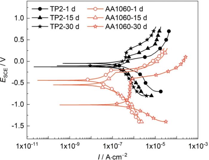图4给出了TP2铜合金和AA1060铝合金在55%的乙二醇-水溶液中偶合浸泡一段时间后的极化曲线。根据图4所示的数据,随偶合时间从1 d延长至30 d,AA1060铝合金的阴极和阳极电流密度均增大,这表明电偶效应作用下,AA1060铝合金的阴、阳极过程显著加速。而且,偶合后其腐蚀电位从-440.9 mV负移至-1010.0 mV,表明偶合后其阳极过程的加速更显著。相较之下,TP2铜合金的阴极和阳极电流密度随偶合时间的延长而减小,表明电偶效应作用下,TP2铜合金的阴、阳极过程受到抑制。值得注意的是,在偶合浸泡1和15 d时,TP2铜合金阴极分支与AA1060铝合金阳极分支交点位于AA1060铝合金的点蚀电位,在强阳极极化作用下,AA1060铝合金处于相对活性较高的状态,发生自发点蚀的风险较高。在偶合浸泡30 d时,两种材料的极化曲线交点下降到AA1060铝合金的钝化区,AA1060铝合金发生自发点蚀的风险减弱。